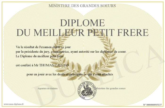 Envoyez par email votre Diplôme du meilleur petit frère personalisé