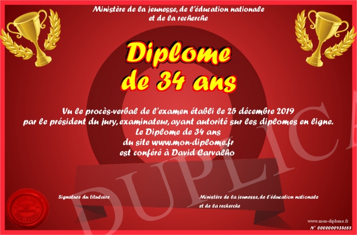Envoyez par email votre Diplôme de 34 ans personalisé