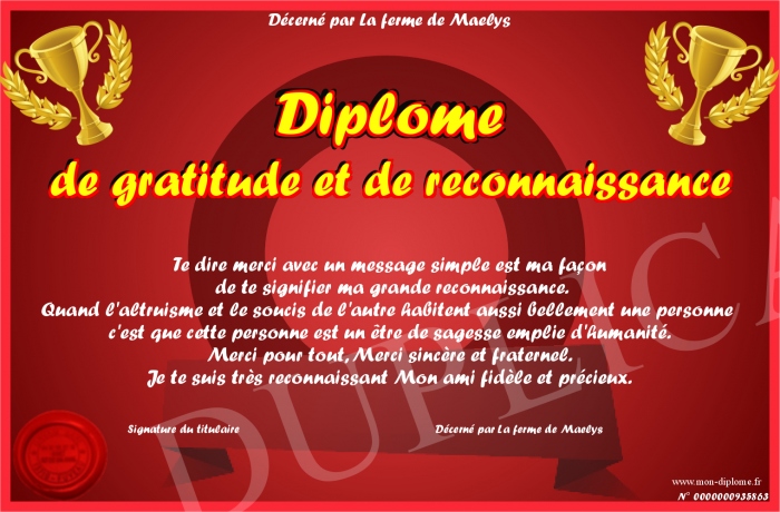 Envoyez par email votre Diplome de gratitude et de reconnaissance personalisé