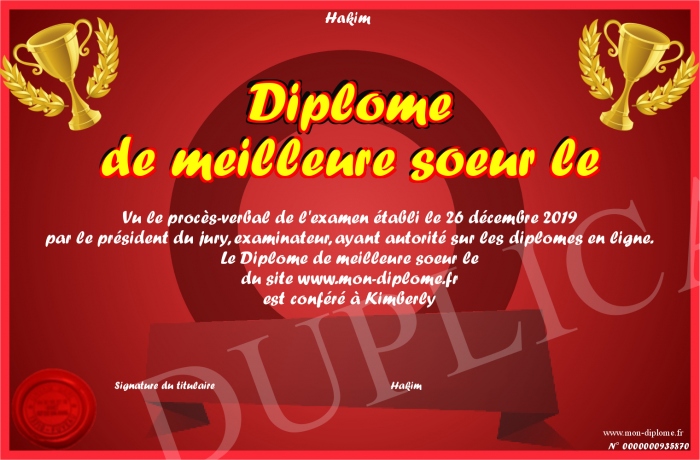 Envoyez par email votre Diplôme de meilleure soeur le personalisé
