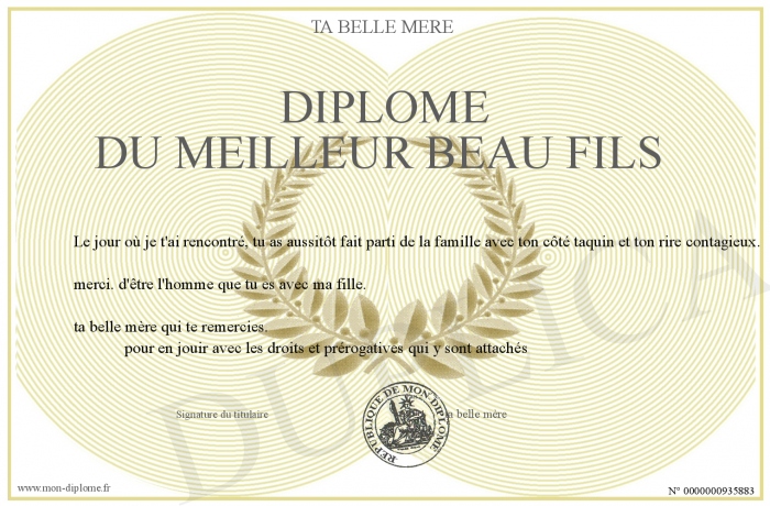 Envoyez par email votre Diplôme du meilleur beau fils personalisé