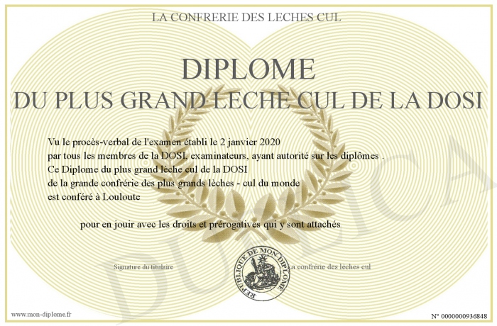 Envoyez par email votre Diplôme du plus grand lèche cul de la DOSI personalisé