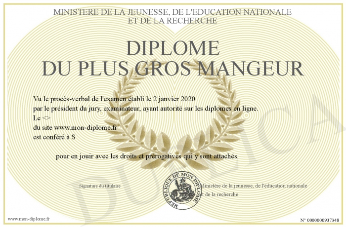 Envoyez par email votre Diplôme du plus gros mangeur personalisé