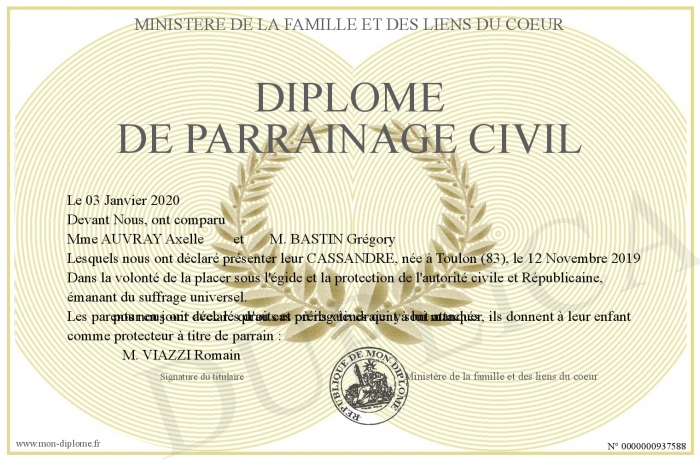 Envoyez par email votre Diplôme de parrainage civil personalisé