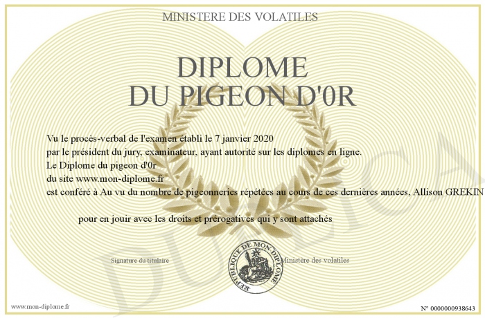 Envoyez par email votre Diplôme du pigeon d'0r personalisé