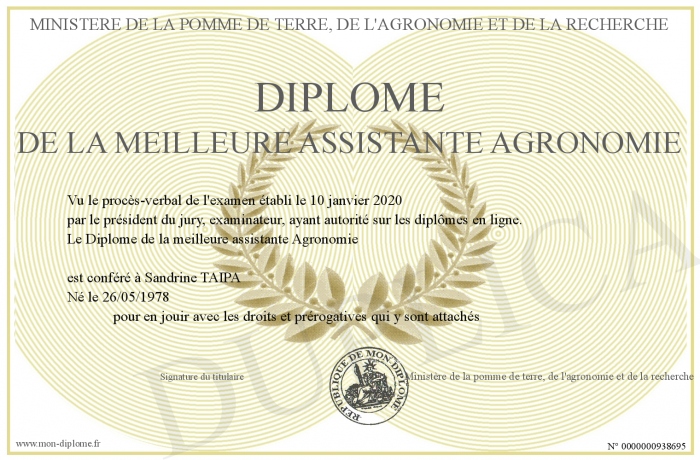 Envoyez par email votre Diplôme de la meilleure assistante Agronomie personalisé