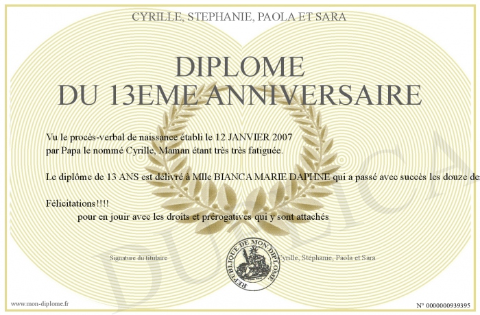 Envoyez par email votre Diplôme du 13ème anniversaire personalisé