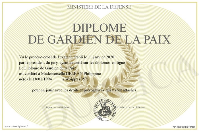 Envoyez par email votre Diplôme de Gardien de la Paix personalisé