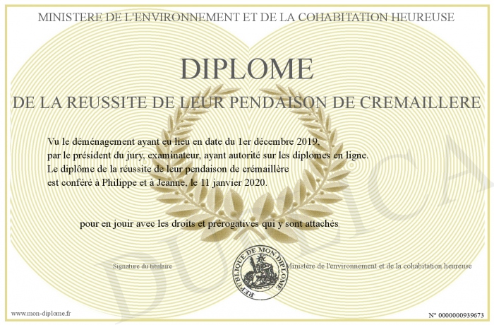 Envoyez par email votre Diplôme de la réussite de leur pendaison de crémaillère personalisé