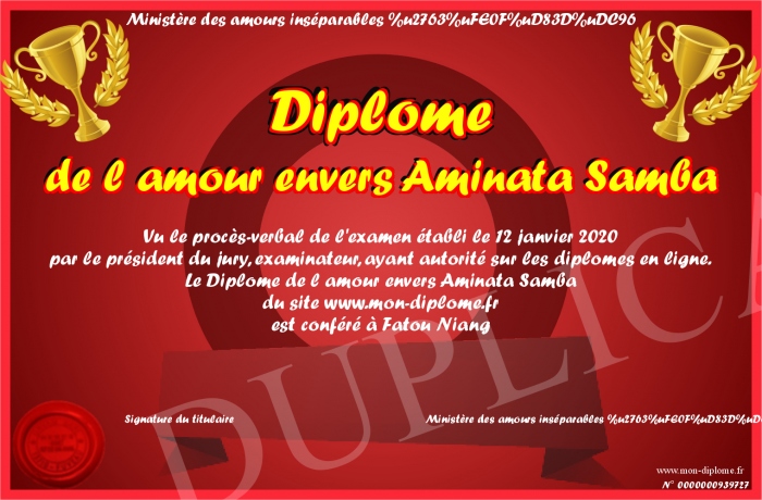 Envoyez par email votre Diplôme de l amour envers Aminata Samba personalisé