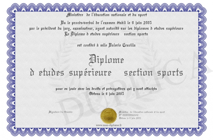 Envoyez par email votre Diplôme d etudes supérieure section sports personalisé