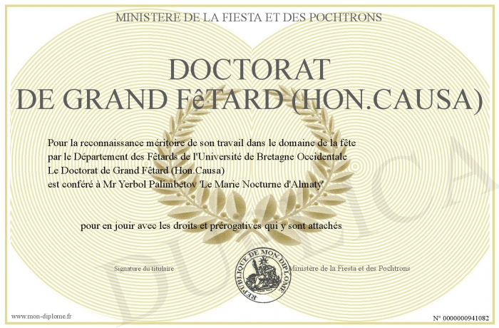 Envoyez par email votre Doctorat de Grand Fêtard (Hon.Causa) personalisé