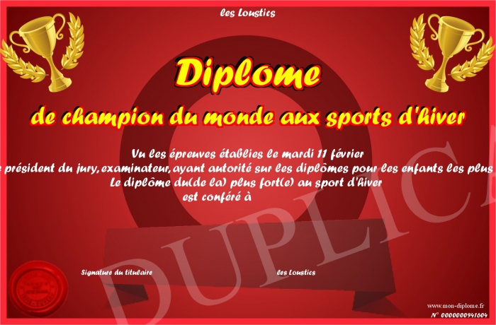 Envoyez par email votre Diplôme de champion du monde aux sports d'hiver personalisé