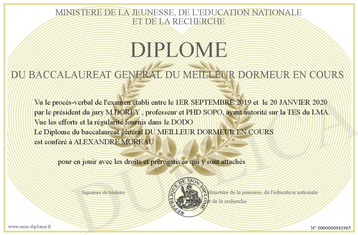Envoyez par email votre Diplôme du baccalaureat général DU MEILLEUR DORMEUR EN COURS personalisé
