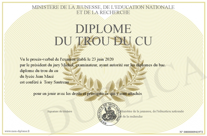 Envoyez par email votre diplome du trou du cu personalisé