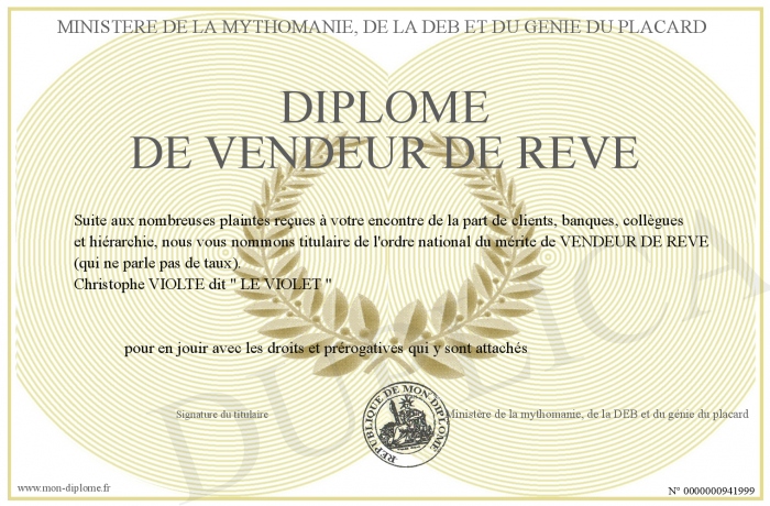 Envoyez par email votre Diplôme dE VENDEUR DE REVE personalisé