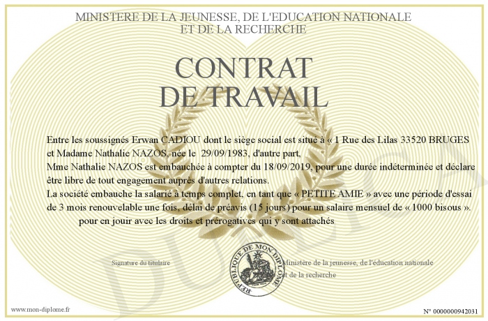 Envoyez par email votre CONTRAT DE TRAVAIL personalisé