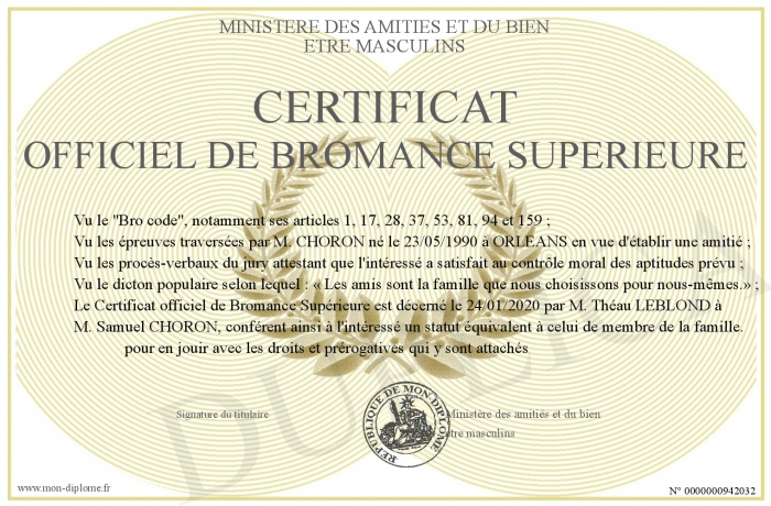 Envoyez par email votre Certificat Officiel de Bromance Supérieure personalisé