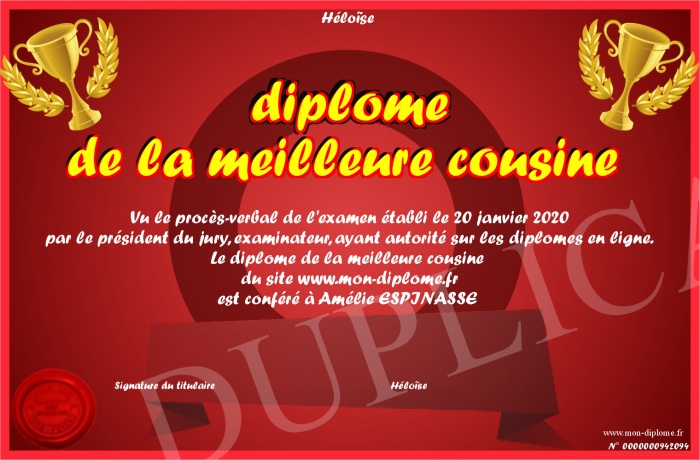 Envoyez par email votre diplôme de la meilleure cousine personalisé