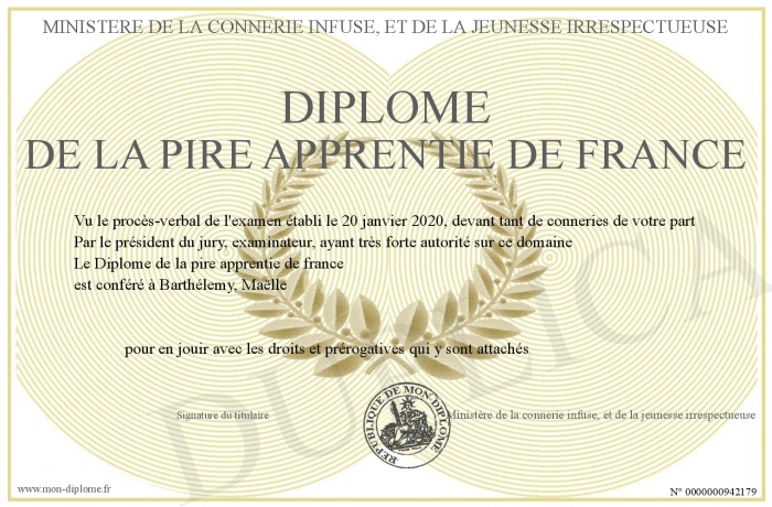 Envoyez par email votre Diplôme de la pire apprentie de france personalisé