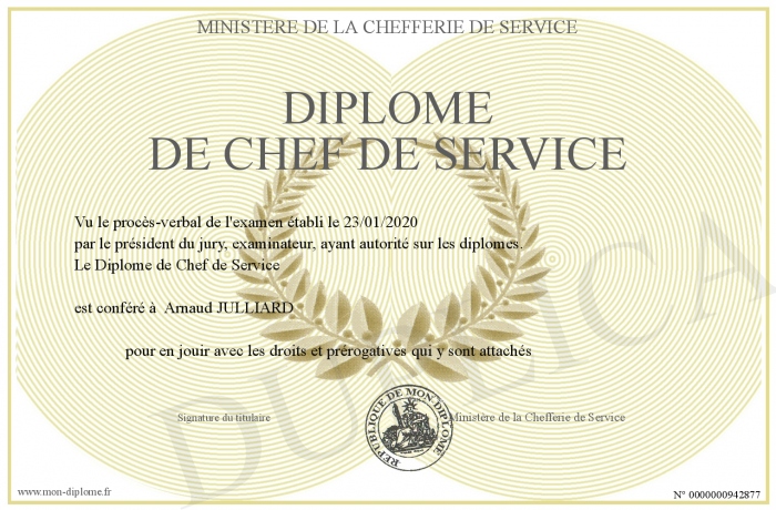 Envoyez par email votre Diplôme de Chef de Service personalisé