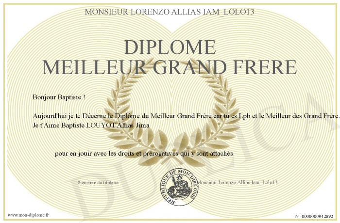 Envoyez par email votre Diplôme Meilleur Grand Frère personalisé