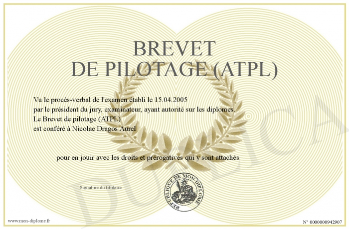Envoyez par email votre Brevet de pilotage (ATPL) personalisé