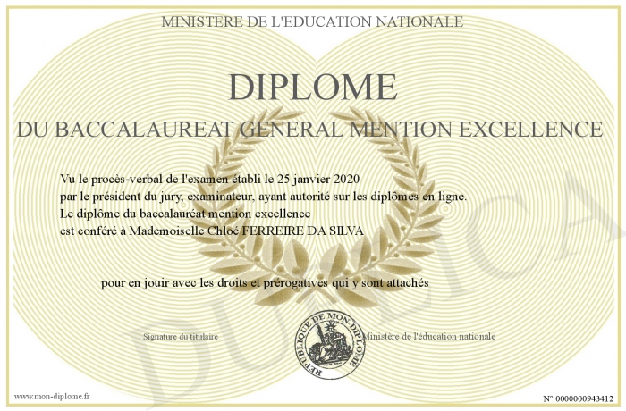 Envoyez par email votre Diplôme du baccalauréat général mention excellence personalisé
