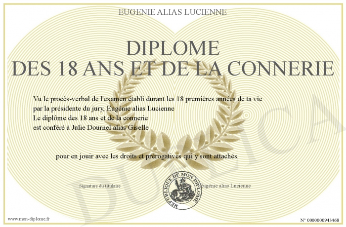 Envoyez par email votre Diplôme des 18 ans et de la connerie personalisé