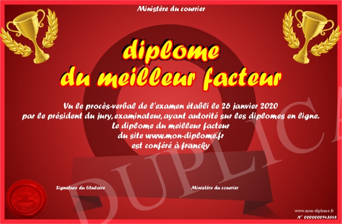Envoyez par email votre diplome du meilleur facteur personalisé