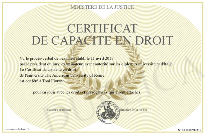 Envoyez par email votre Certificat de capacité en droit personalisé