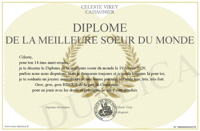 Envoyez par email votre Diplôme de la meilleure soeur du monde personalisé