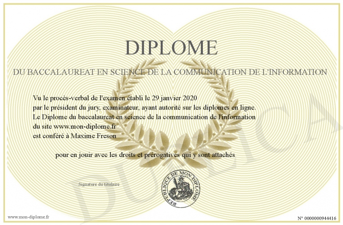 Envoyez par email votre Diplôme du baccalaureat en science de la communication de l'information personalisé