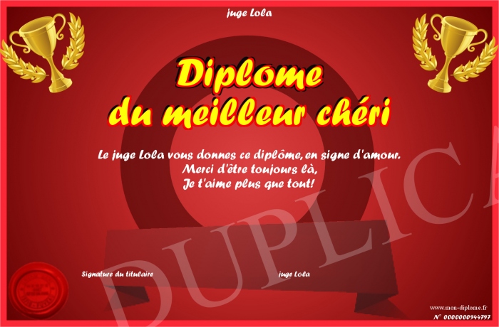 Envoyez par email votre Diplôme du meilleur chéri personalisé