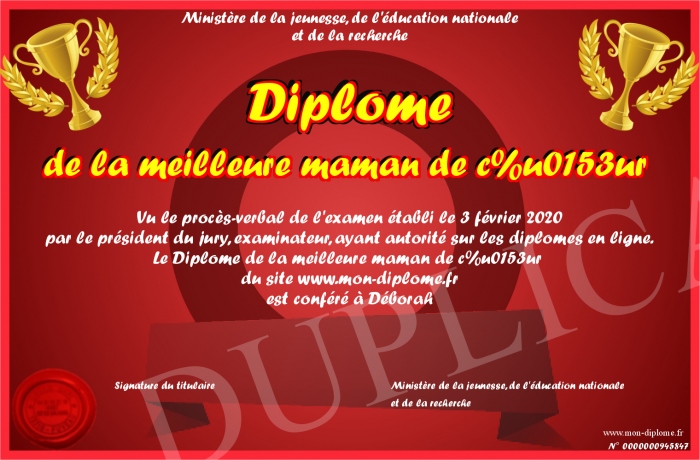 Envoyez par email votre Diplôme de la meilleure maman de coeur personalisé