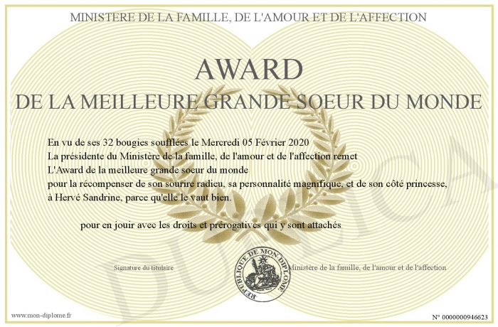 Envoyez par email votre Award de la meilleure grande soeur du monde personalisé