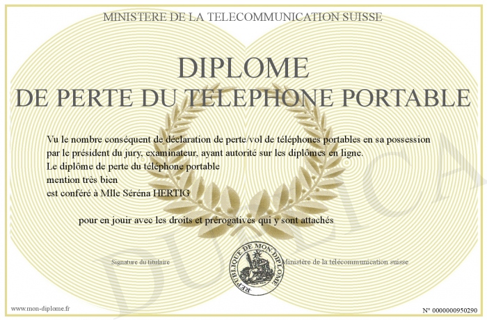 Envoyez par email votre Diplôme de perte du téléphone portable personalisé