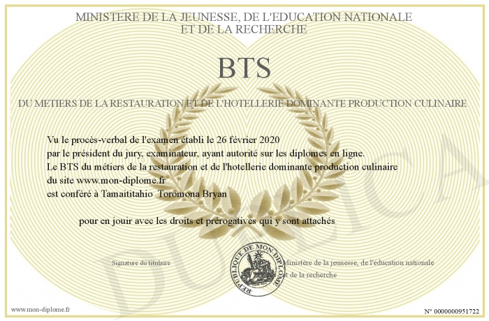 Envoyez par email votre BTS du métiers de la restauration et de l'hôtellerie dominante production culinaire personalisé