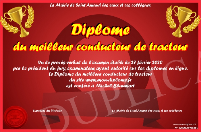 Envoyez par email votre Diplôme du meilleur conducteur de tracteur personalisé