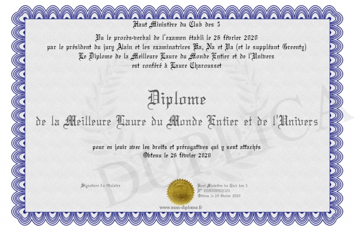 Envoyez par email votre Diplome de la Meilleure Laure du Monde Entier et de l'Univers personalisé