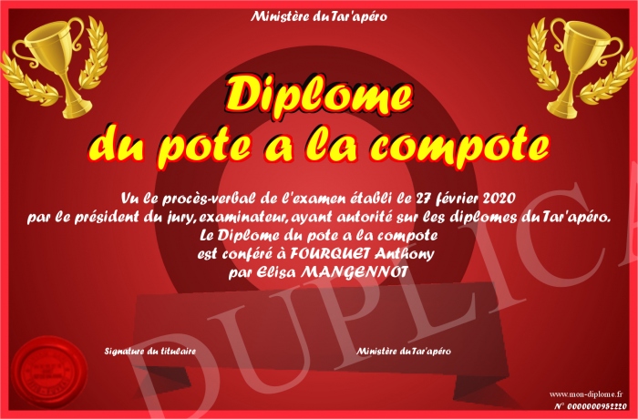 Envoyez par email votre Diplôme du pote a la compote personalisé