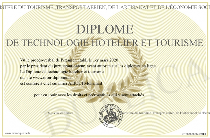 Envoyez par email votre Diplôme de technologie hôtelier et tourisme personalisé