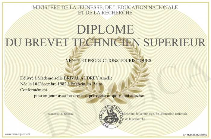 Envoyez par email votre Diplôme du Brevet Technicien Supérieur personalisé