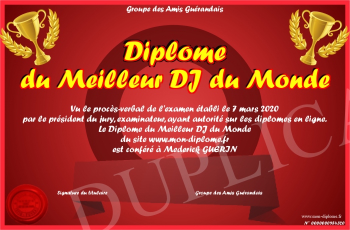 Envoyez par email votre Diplôme du Meilleur DJ du Monde personalisé