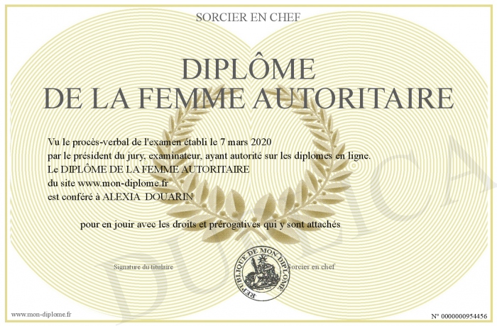 Envoyez par email votre DIPLÔME DE LA FEMME AUTORITAIRE personalisé