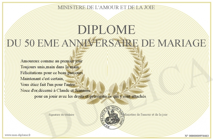 Envoyez par email votre Diplome du 50 ème anniversaire de mariage personalisé