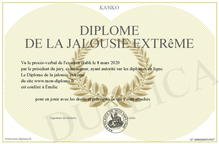 Envoyez par email votre Diplôme de la jalousie extrême personalisé