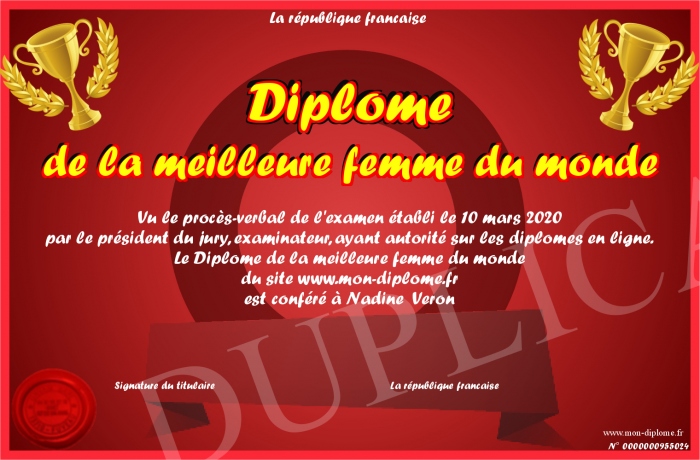 Envoyez par email votre Diplôme de la meilleure femme du monde personalisé