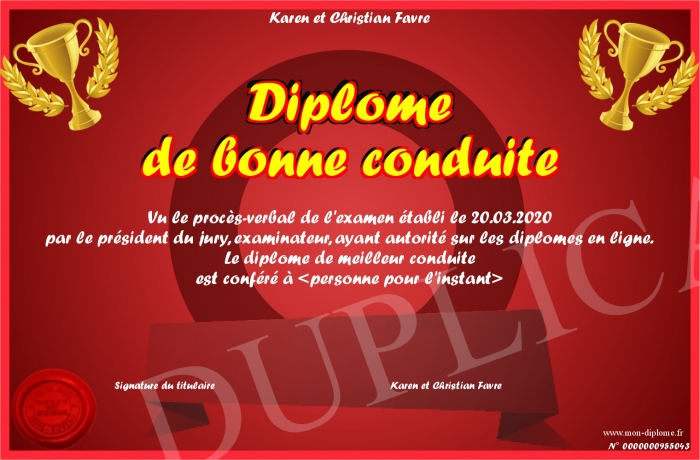 Envoyez par email votre Diplome de bonne conduite personalisé