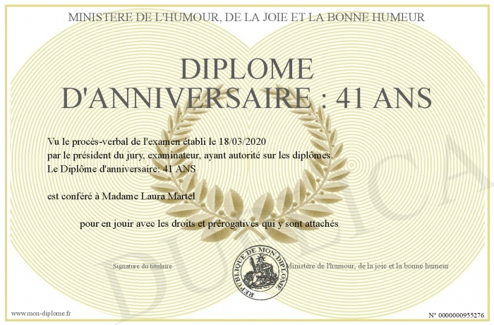 Envoyez par email votre Diplôme d'Anniversaire : 41 ANS personalisé